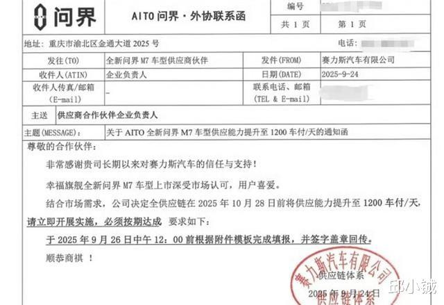 面对消费者的热情,鸿蒙智行努力优化产能,把全新问界M7高效地交付到车主手中。新车上市首周,问界M7就在赛力斯重庆超级工厂交付给了首批车主。但厂家并不满足于此,已经向供应商伙伴发函,要求全新问界M7全供应链在10月28日前将供应能力提升至1200车付/天,并告知“请立即开展实施,必须按期达成”。